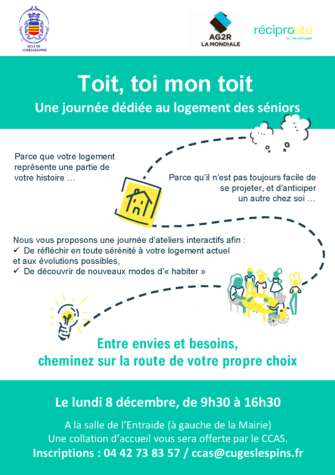 Le CCAS en partenariat avec AG2R la mondiale organise une journée d’ateliers dédiée aux logements des séniors le lundi 8 décembre de 9h30 à 16h30, à la salle de l’Entraide.