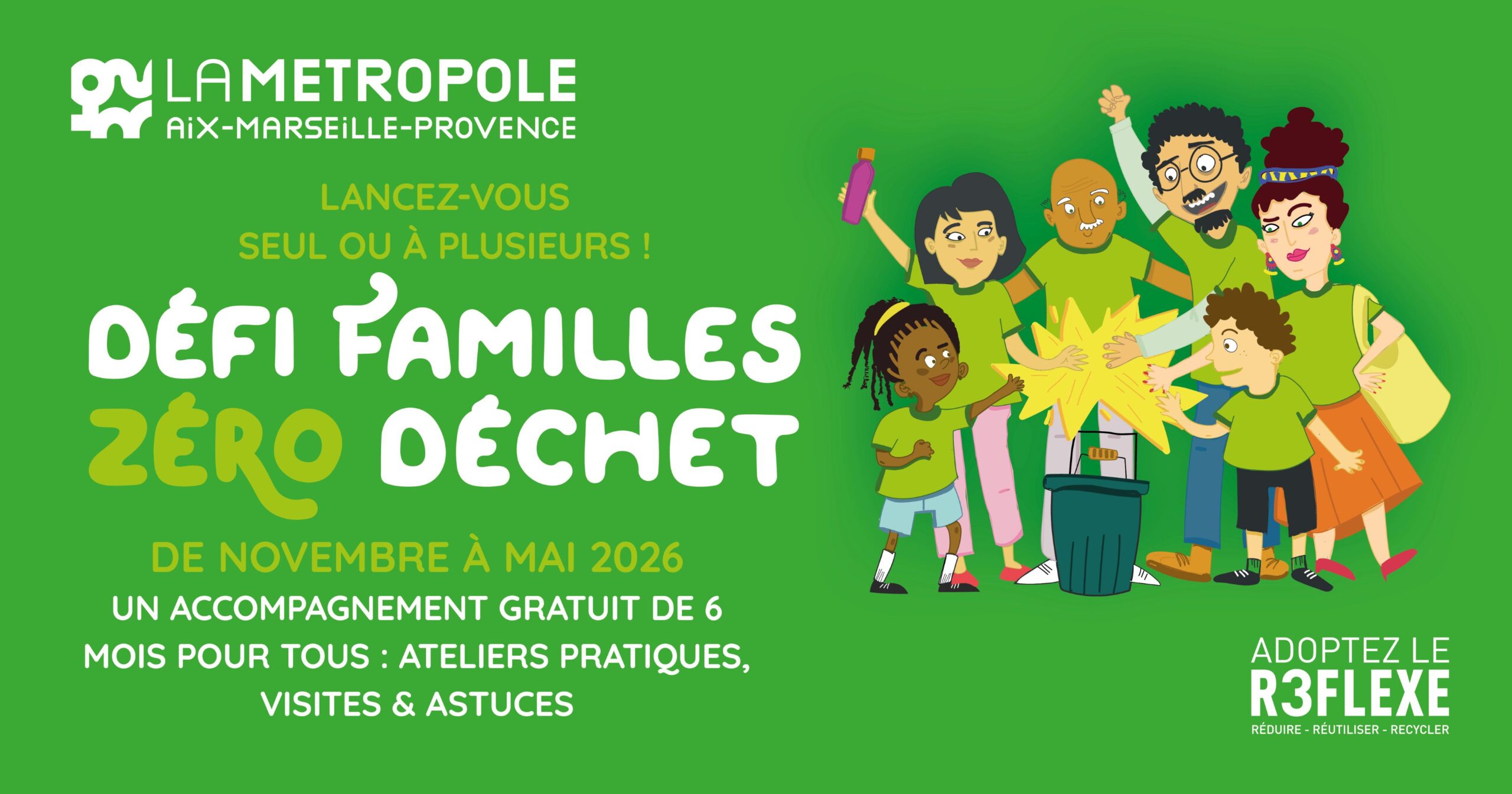 Inscription obligatoire en ligne avant le 2 novembre 2025 depuis le lien suivant : https://dechets.ampmetropole.fr/particuliers/je-participe/defi-familles-zero-dechet/