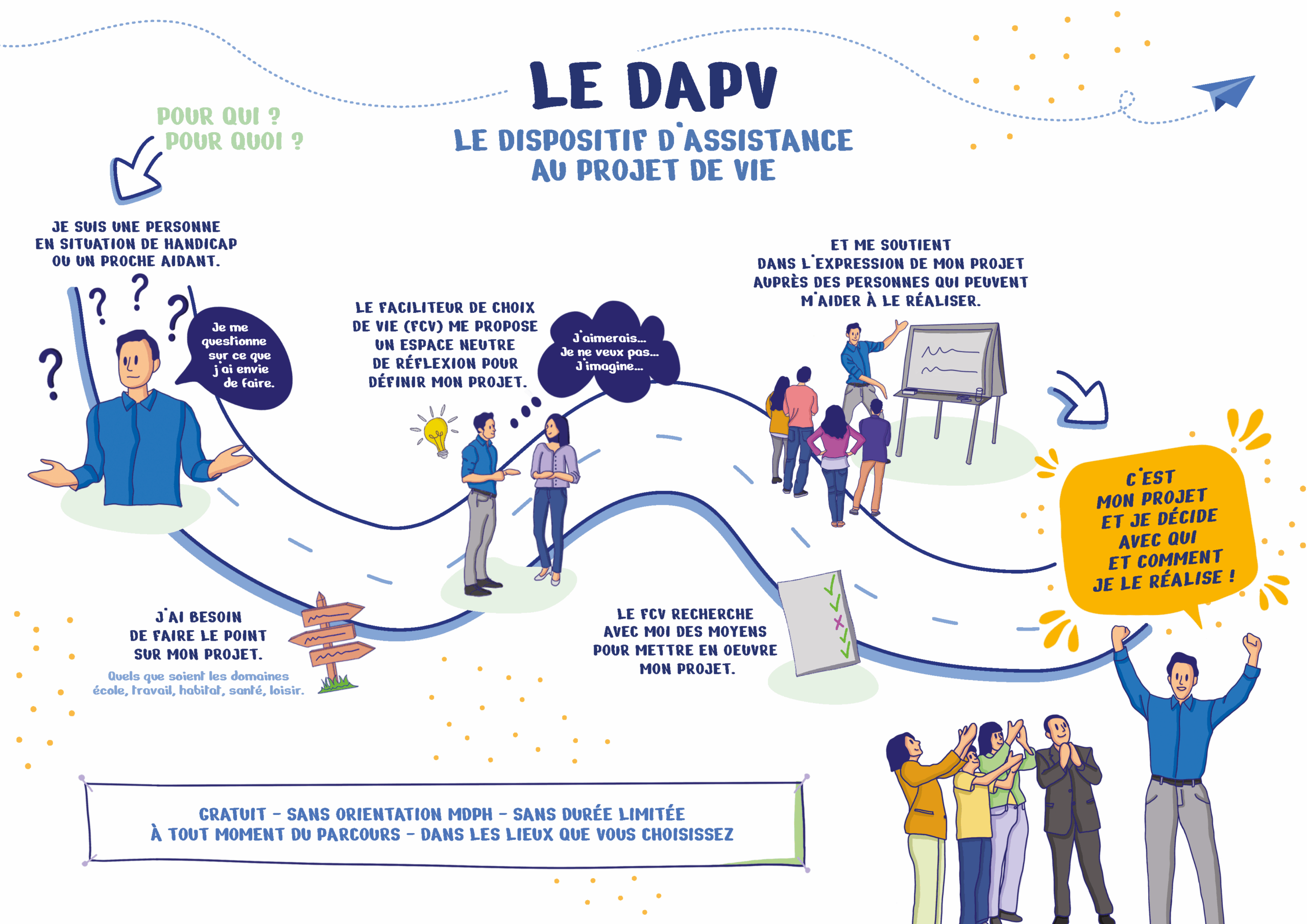Le dispositif d’assistance au projet de vie est un accompagnement destiné à aider une personne à définir, structurer et concrétiser son projet de vie, notamment lorsqu’elle est en situation de handicap ou rencontre des difficultés importantes d’autonomie.