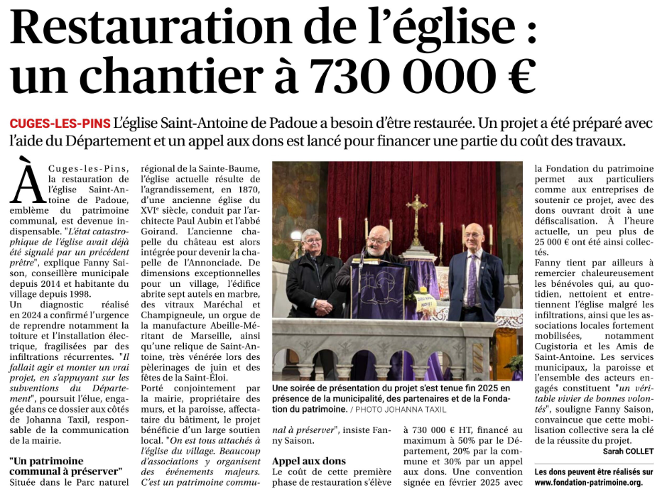 Depuis le début de l’année, les associations locales comme Cugistoria et Les Amis de Saint-Antoine se mobilisent pour la restauration de l’église. Janvier a marqué le coup d’envoi avec le gâteau des Rois de la Paroisse. Le 17 février, les jeunes de l’aumônerie Cuges-Gémenos ont participé à l’après-midi patinoire encadrée par le Comité des fêtes, qui a organisé une vente de crêpes au profit de l’église. À cette occasion, le Club de l’Âge d’Or a également apporté une belle contribution pour la restauration de l’église.